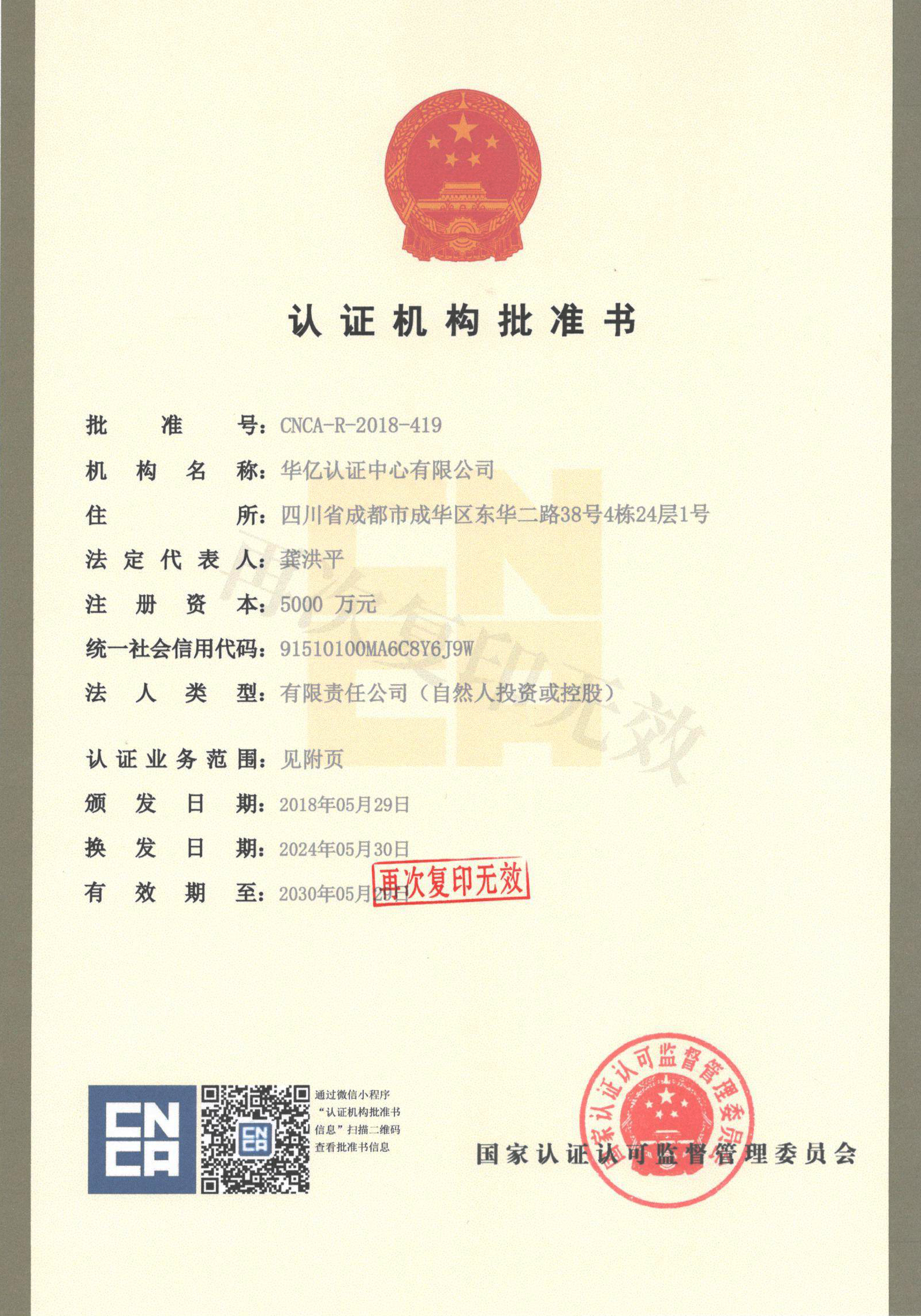 认证机构批准书